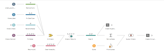 •데이터를 확실하게 결합, 변형 및 필터링, 정리(흐름에서 r및 파이썬 스크립트 사용가능)