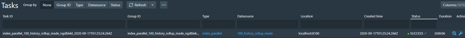 [root@localhost tutorial]# curl -X 'POST' -H 'Content-Type:application/json' -d @100-index-rollup.json http://localhost:8081/druid/indexer/v1/task